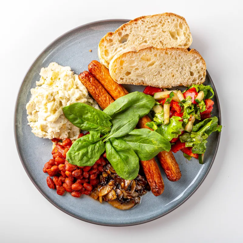 Куриные колбаски, яйцо скрэмбл, чиабатта, фасоль в томате, грибы жареные с луком, сезонный салат, багет