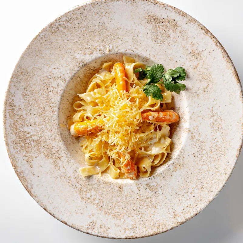 Тигровые креветки, фетучини, пармезан, сливочный соус
