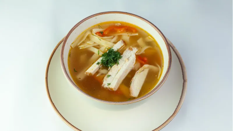 Курица, лук, морковь, болгарский перец, лапша, зелень, специи