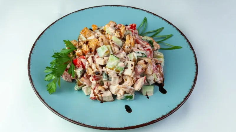 Помидоры, огурцы, сухари, курица, майонез, бальзамический уксус