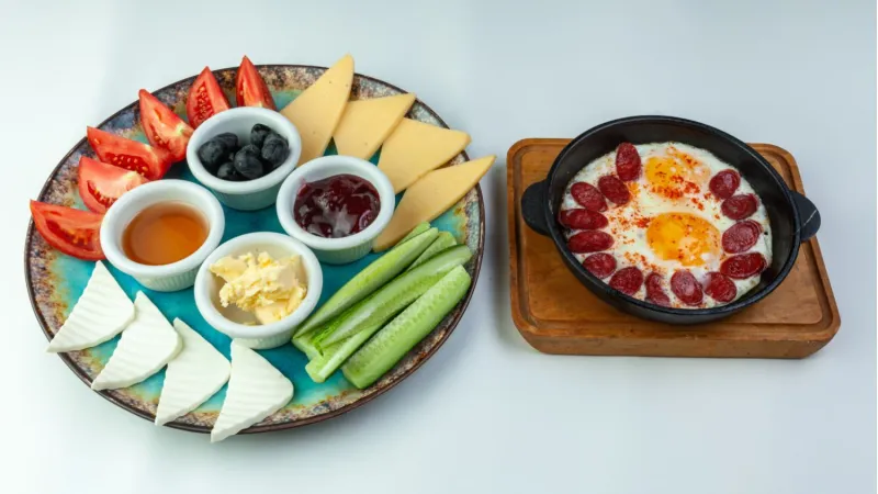 Яйцо, колбаски охотничьи, красная фасоль, грибы, помидор, огурцы, мед, джем, масло сливочное, маслины, сыр фетакса, сыр гауда