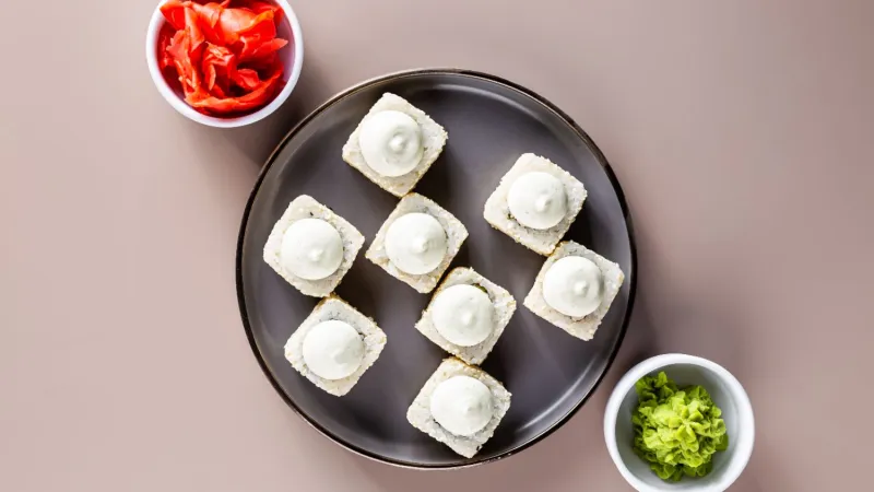 Лосось, рис, нори, творожный сыр, огурец, сухари панировочные, соус терияки