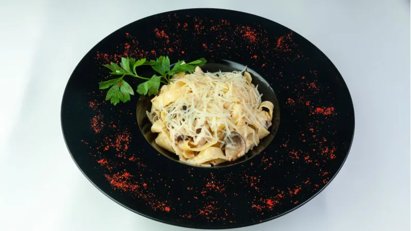 Куриное филе, грибы, сыр пармезан, феттучини, сливочный соус, специи