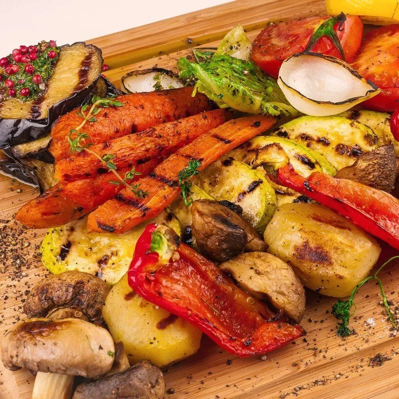 Шампиньоны, помидор, болгарский перец, баклажан, цуккини, лук
