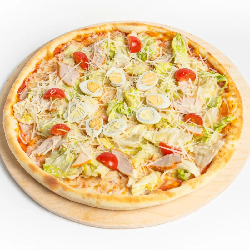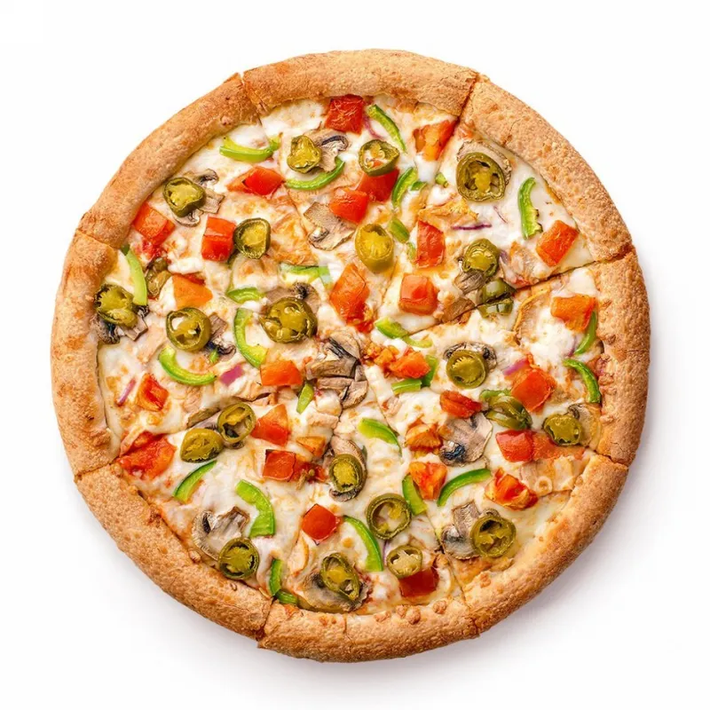 Курица, перец халапеньо, кукуруза, перец болгарский, моцарелла, пицца соус