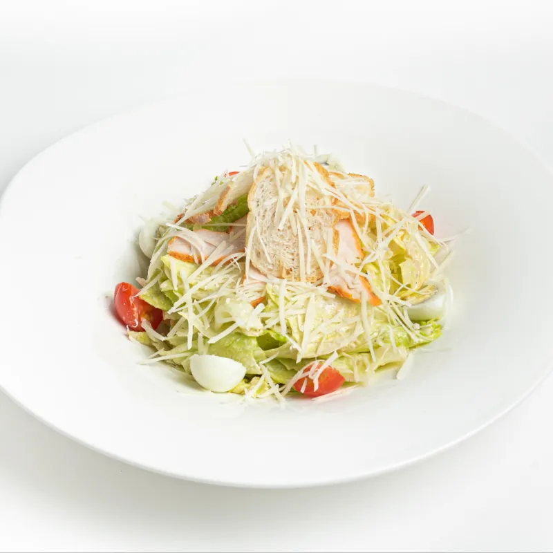Курица, салат айсберг, яйцо перепелиное, черри томаты, пармезан, сыр моцарелла, цезарь соус