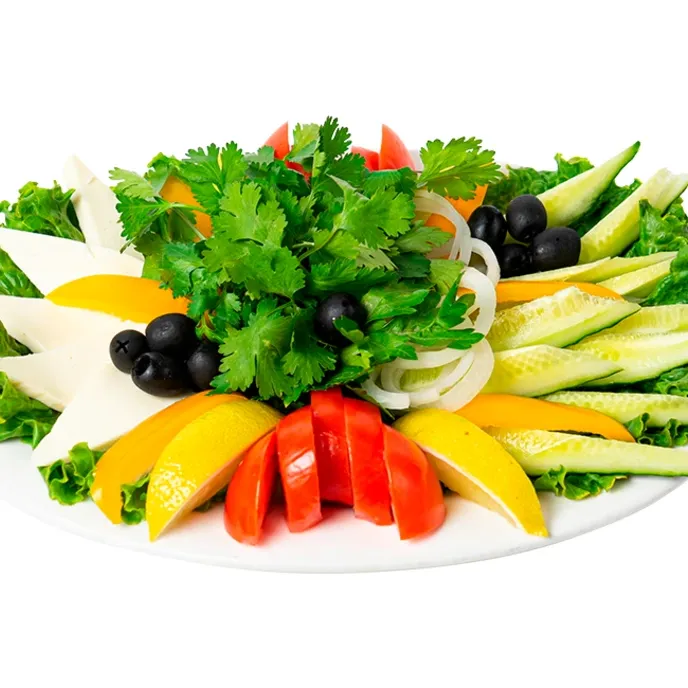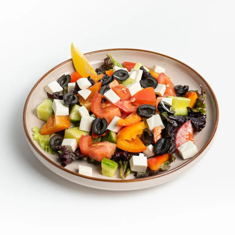 помидоры, огурцы, болгарский перец, фетакса, красный лук, лист салата, маслины. 300 гр