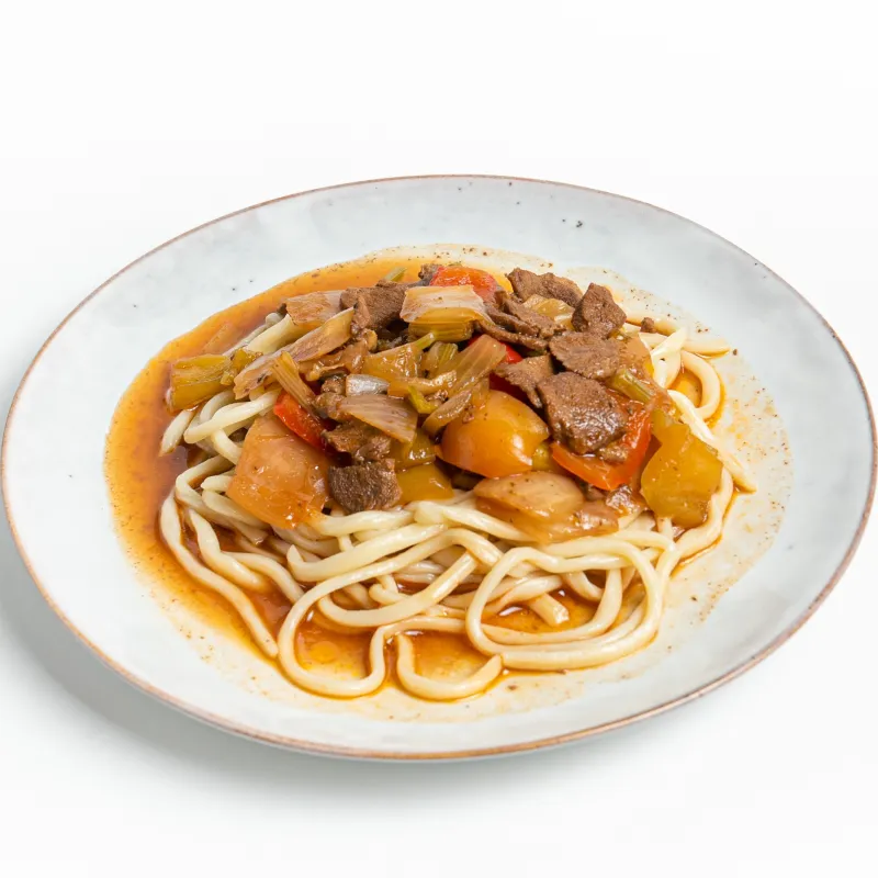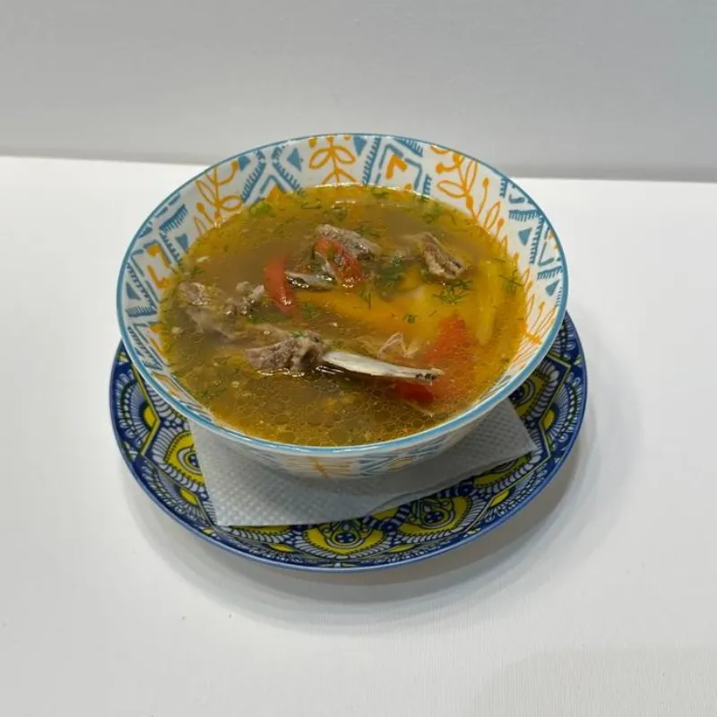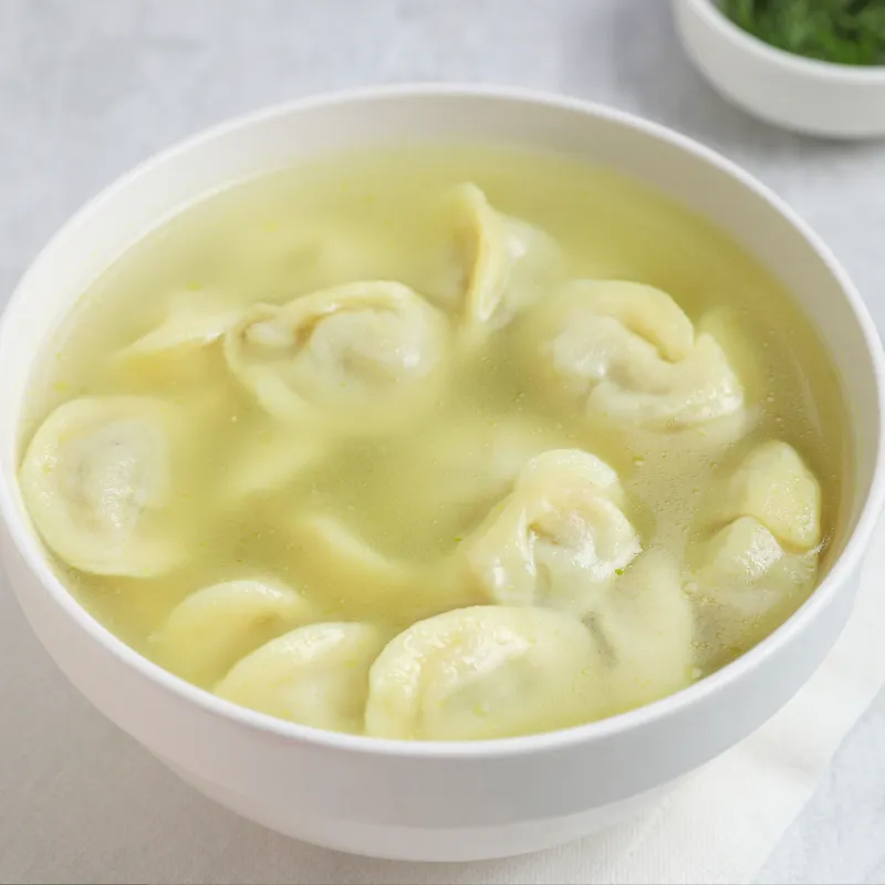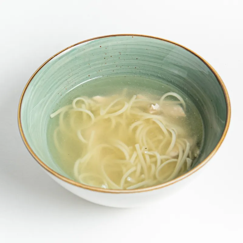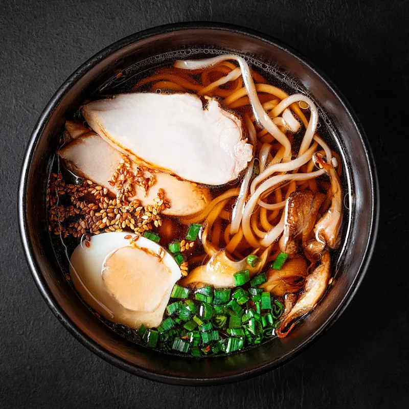 Насыщенный азиатский суп с корейской лапшой, телятиной, яйцом, зеленью, черри и водорослями