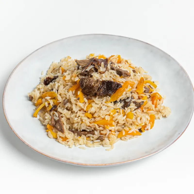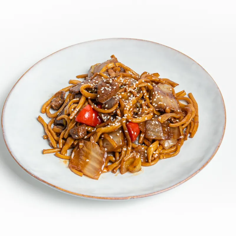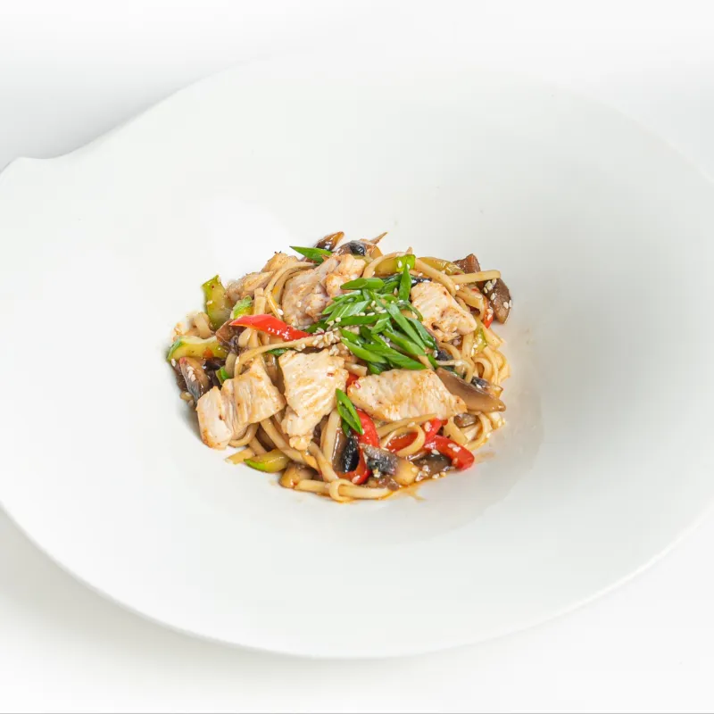Куриное филе, рисовая лапша, болгарский перец, лук, черри томаты, морковь, кинза, кунжут. 400 гр.