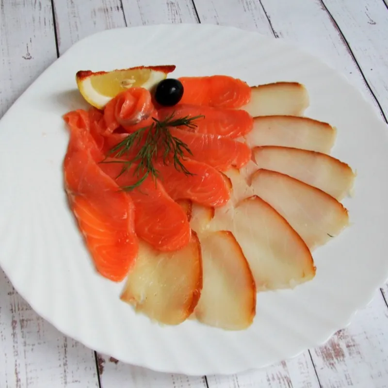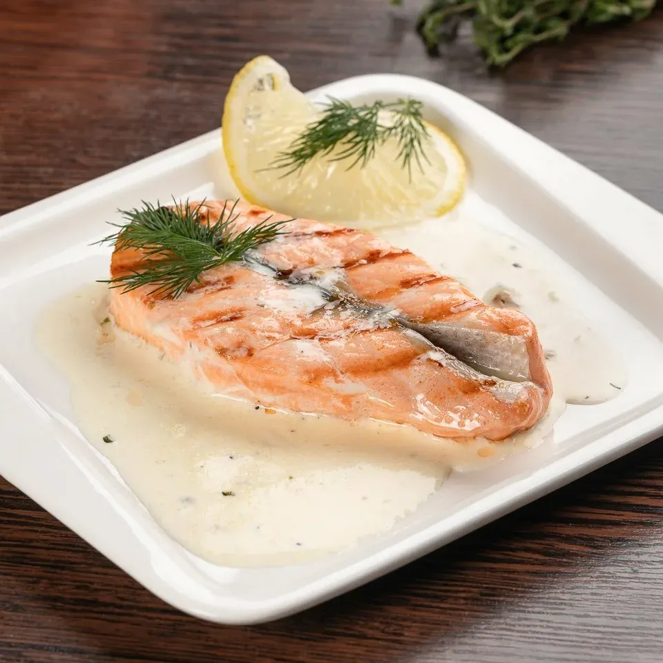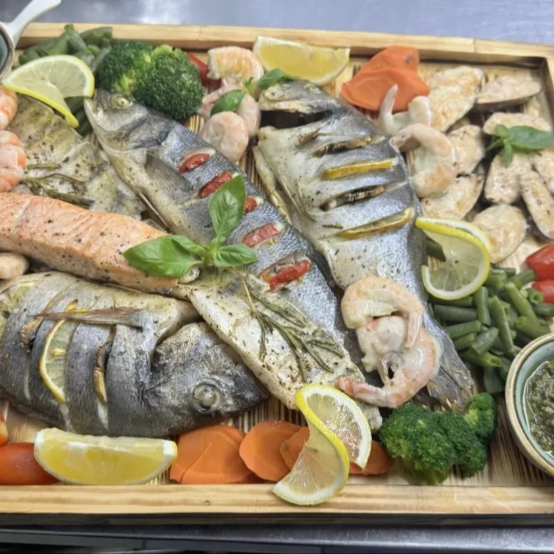 дорада 2 шт, сибас 1 шт, стейк из семги 200 гр, филе судака 500 гр, тигровые креветки, мидии в сливочном соусе с чесноком и зеленью, брокколи, рис, соус
