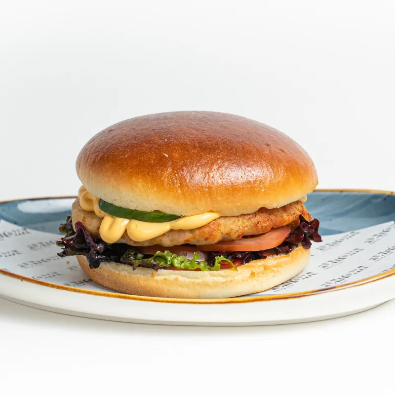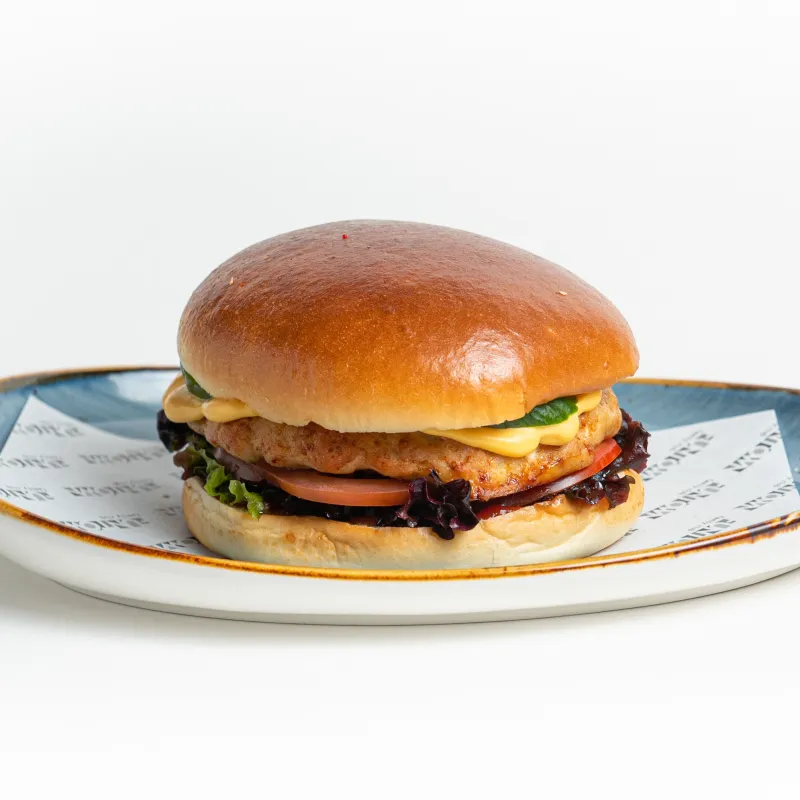 куриная котлета, лист салата, помидор, свежий огурец, лук красный маринованный, сыр моцарелла