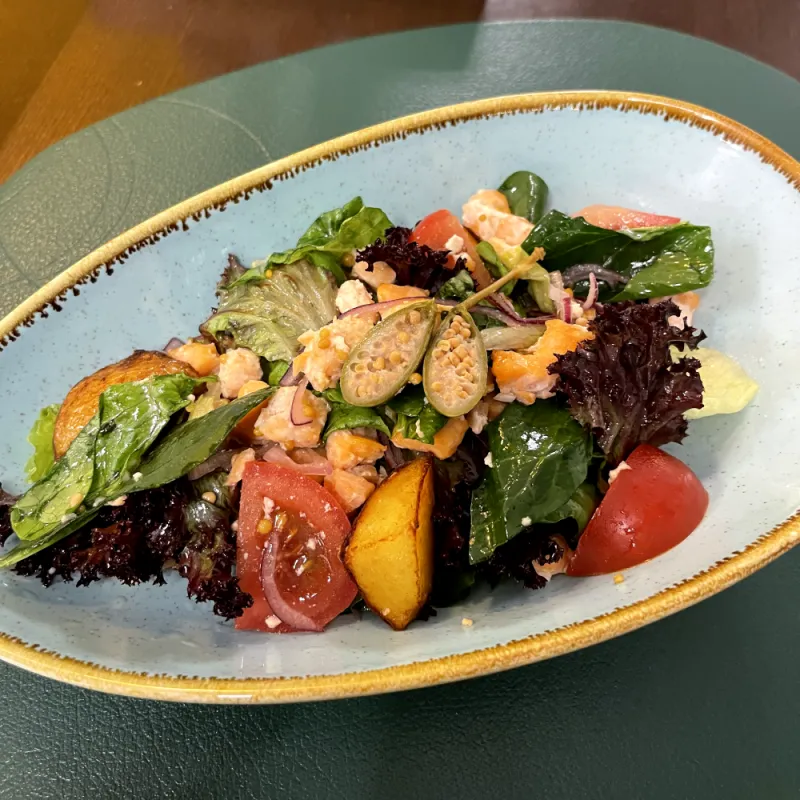 Лосось запеченный, картофель. фасоль стручковая, черри, красный лук, микс салат, соус. 300 гр.