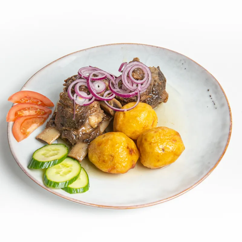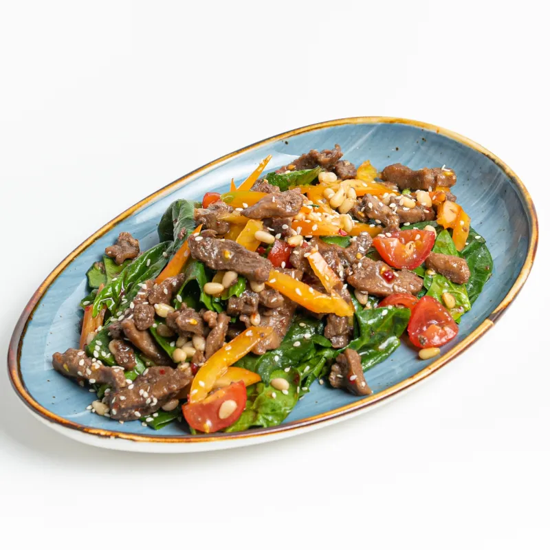 Телятина, картофель, шампиньоны, микс салата, черри, соус. 300 гр.