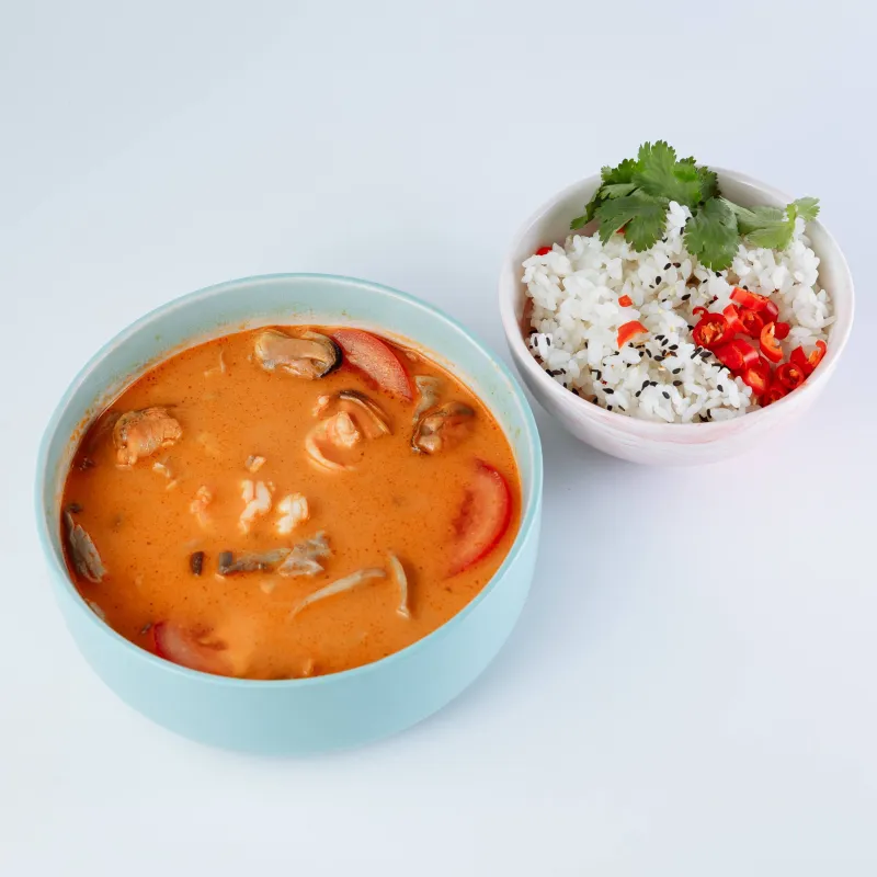традиционное тайское блюдо с креветками,кальмарами, мидиями, пастой том ям, пастой кочудян на кокосовом молоке
