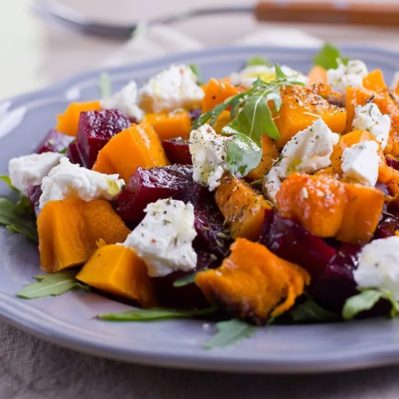 Запеченная свекла, творожный сыр, апельсин, грецкий орех, микс салата, соус