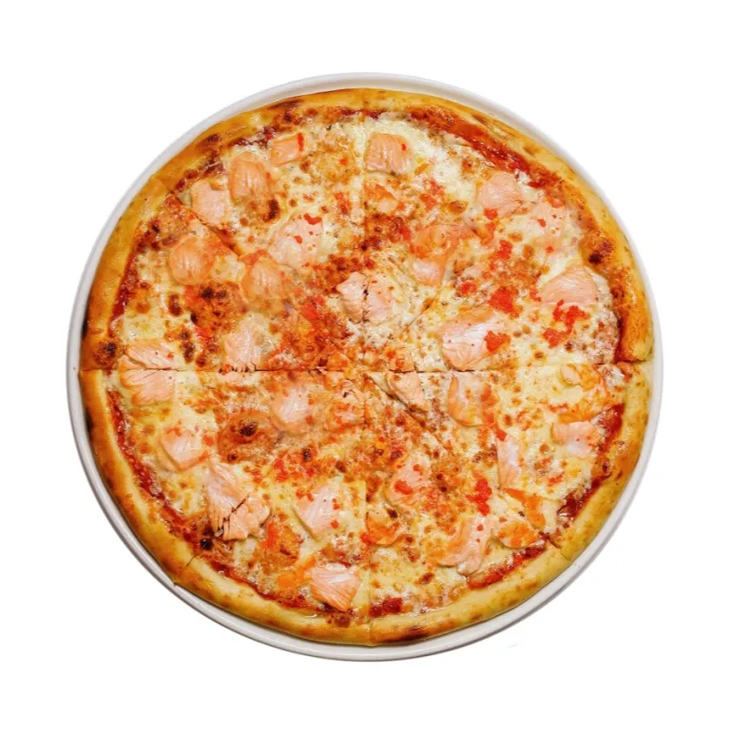 Лосось, сыр моцарелла, сыр креметте, пицца соус из перетертых томатов