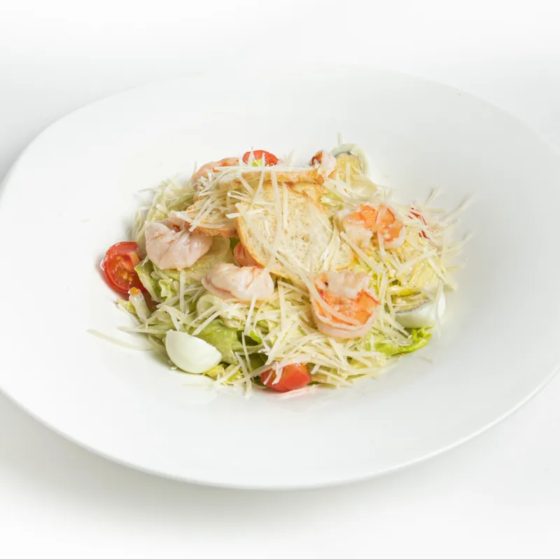 креветки, айсберг, перепелиные яйца,помидоры черри, соус цезарь, пармезан. 330 гр