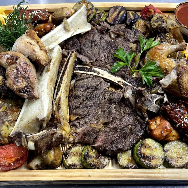 вырезка 600 гр, томленные говяжьи ребра 1 кг, крылышки 700 гр, запеченный кебаб под горчичным соусом 500 гр, цыпленок 800 гр, картофель Айдахо 400 гр, кукуруза, овощи гриль 2 порц, соус 2 вида