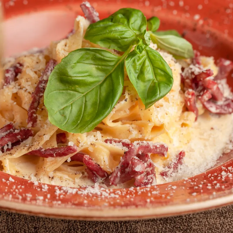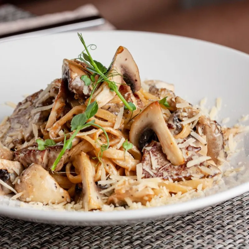 Паста с мраморным мясом (kazbeef), грибами шампиньонам, сливками и сыром пармезан.
