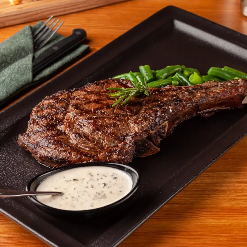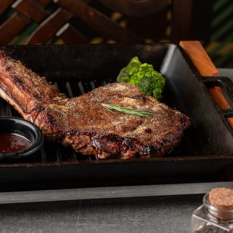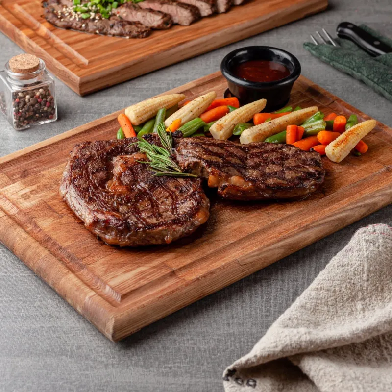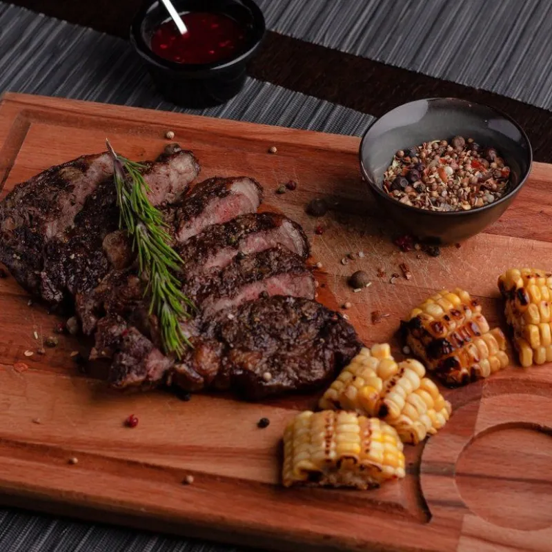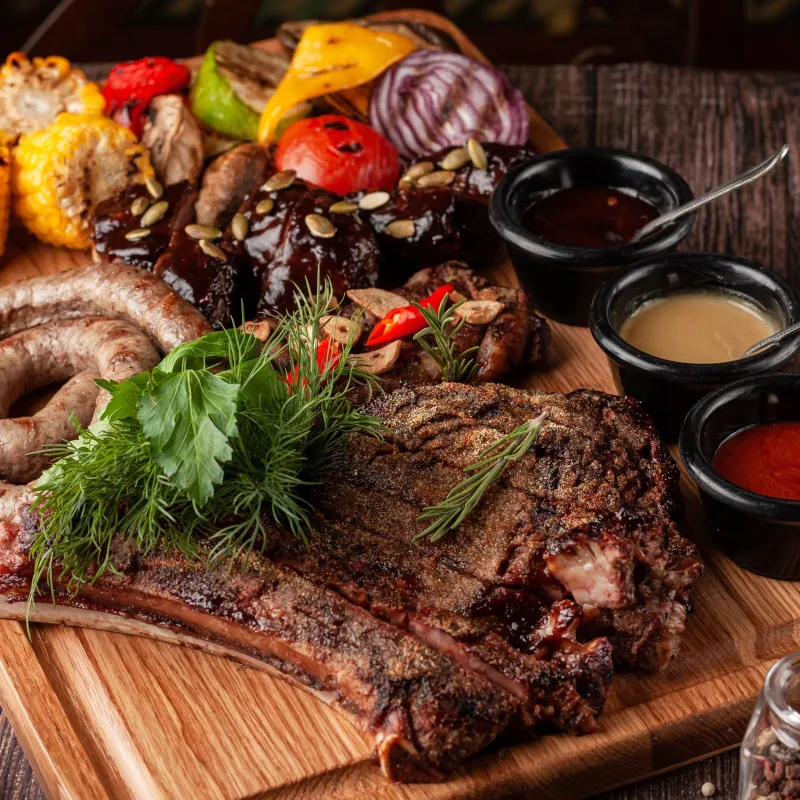 Рамп, рибай на кости, стриплойн, колбаска из говядины, кукуруза и овощи гриль