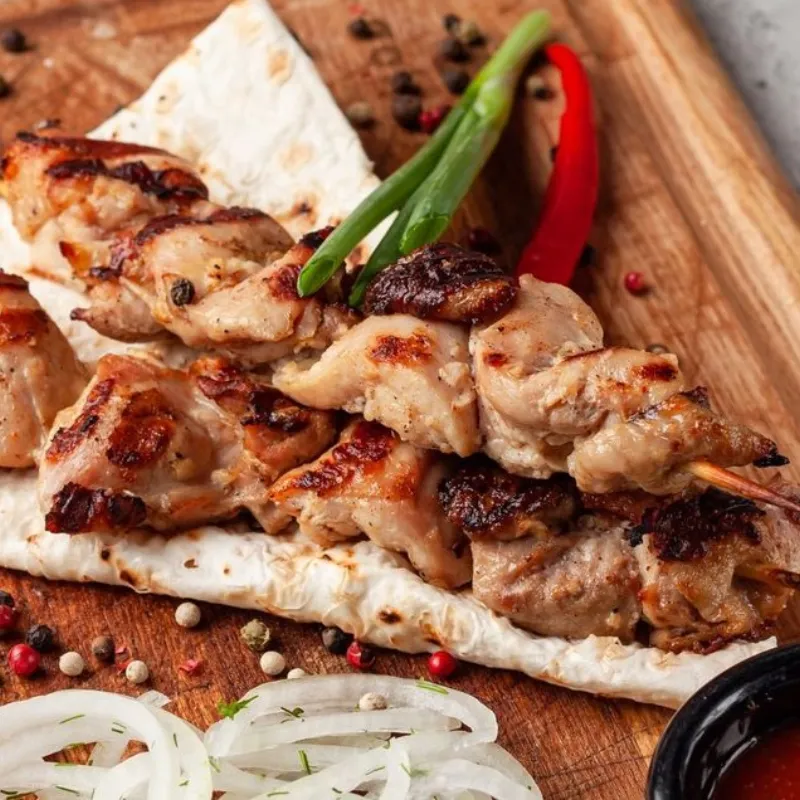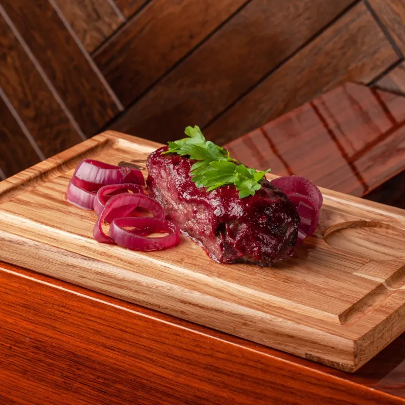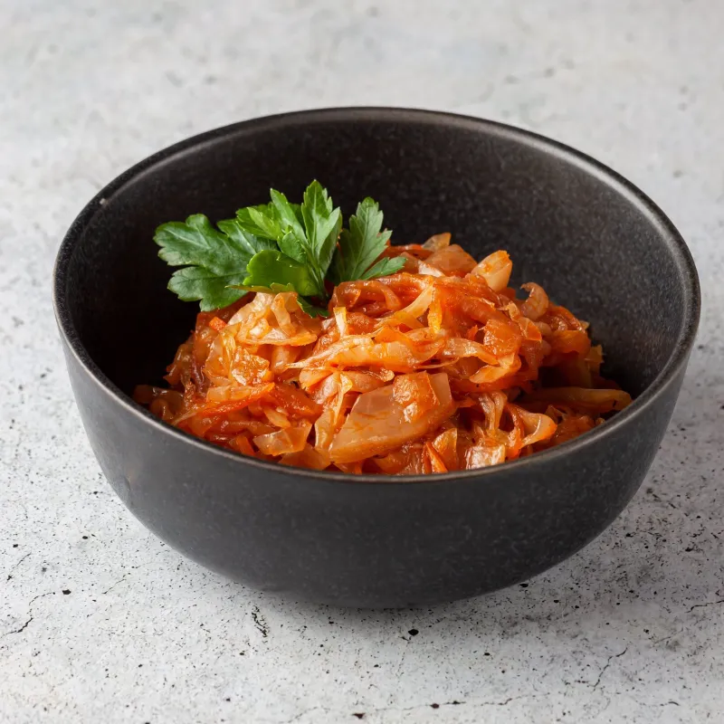 Подается с маринованными луком, картофельными дольками и тушеной капустой