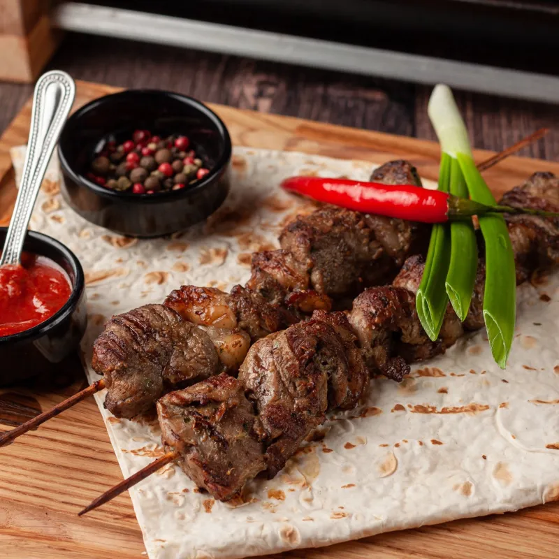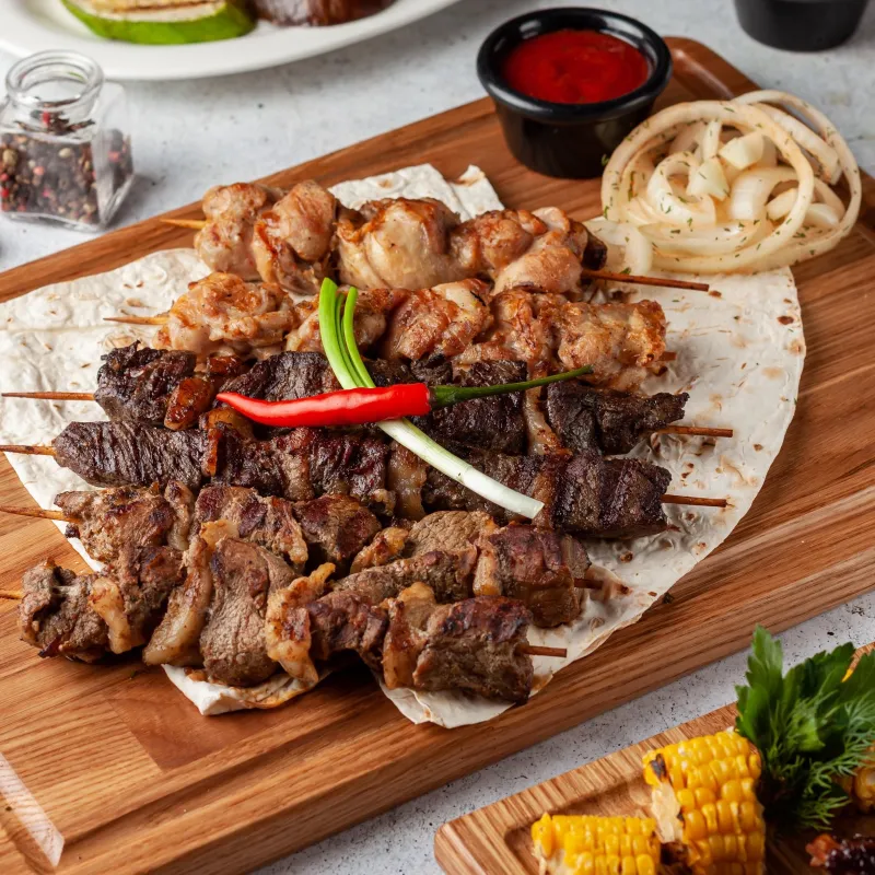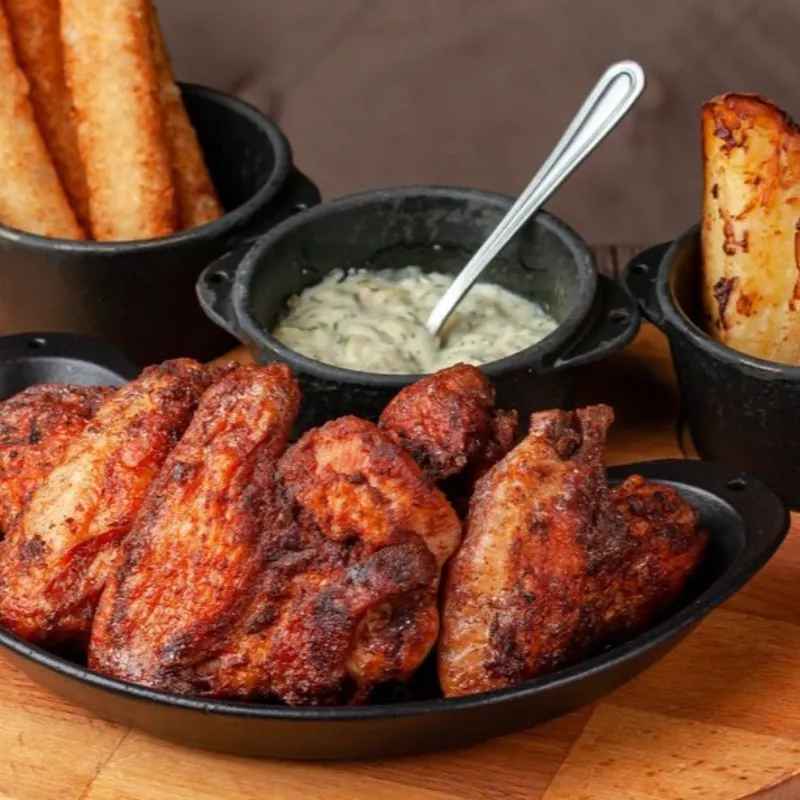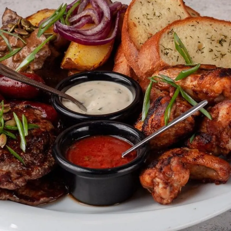 Говяжья печень, крылышки куриные, чесночный багет, колбаски охотничьи чили, медальоны, запеченный картофель