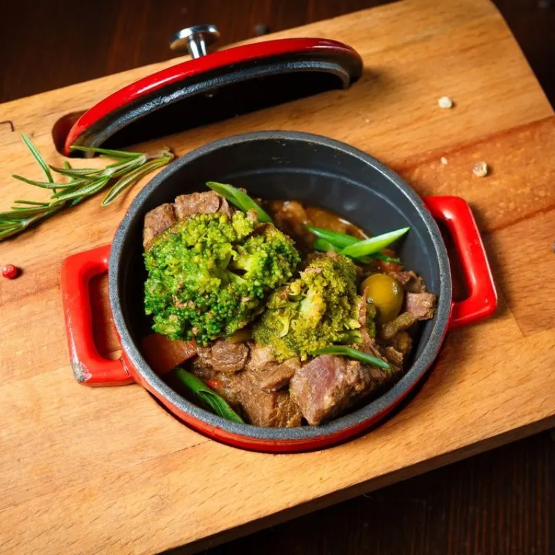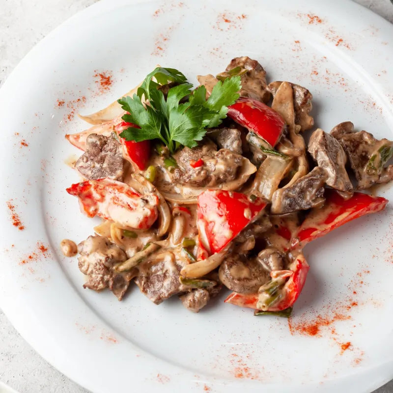 *подается до 15.00 Печень, острый перец чили, болгарский перец, лук, стручковая фасоль в сливочно-устричном соусе