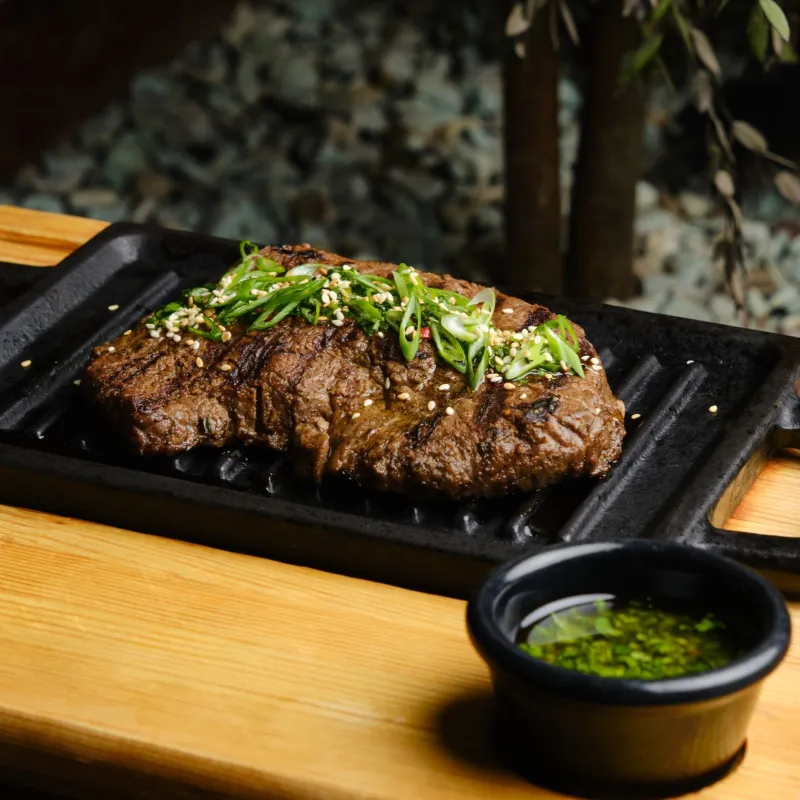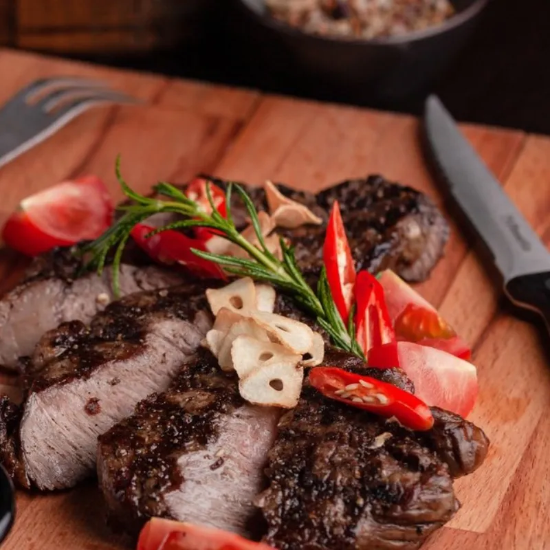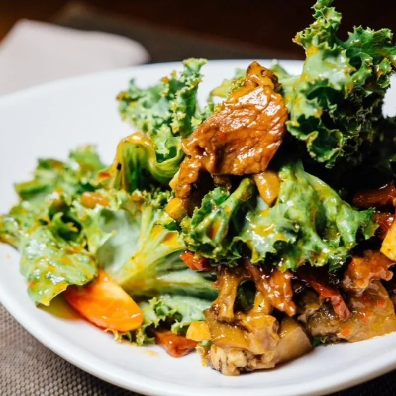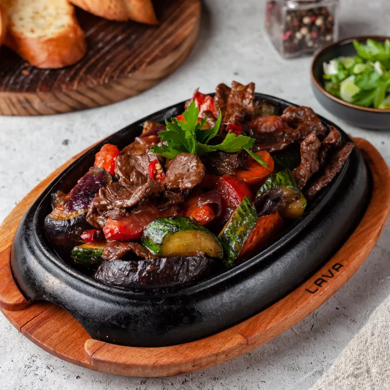 Вырезка говядины, морковь, баклажан, кабачок, огурец, томаты, Чили, соус соево-устричный. Kazbeef.