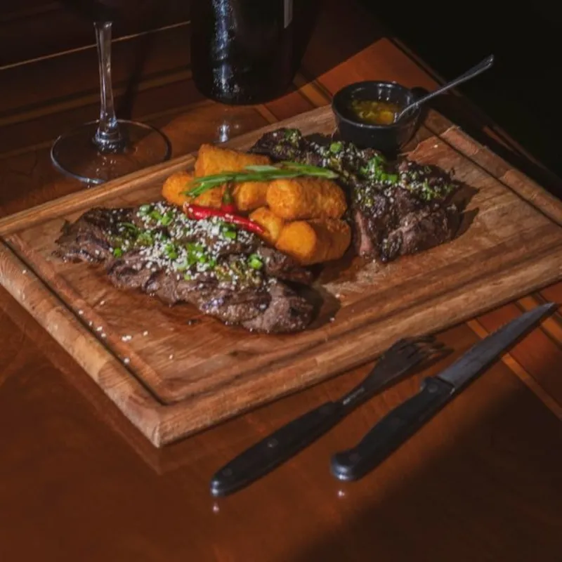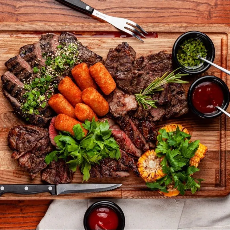 Сет из стейков: томленая говядина, рамп, стриплойн, техас. Подается с кукурузой, картофельными крокетами и 3 видами соуса (кетчуп, барбекю и грибной).