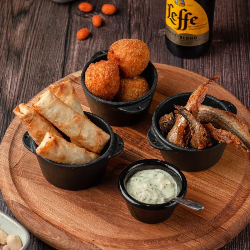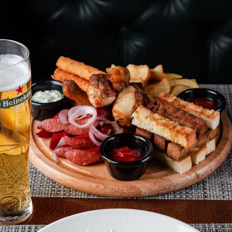 Цыпленок , острые колбаски, сырные палочки, картофельные дольки, сухарики.