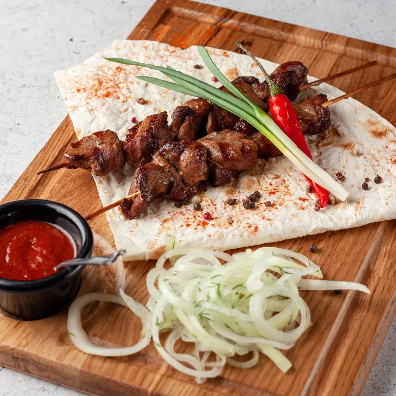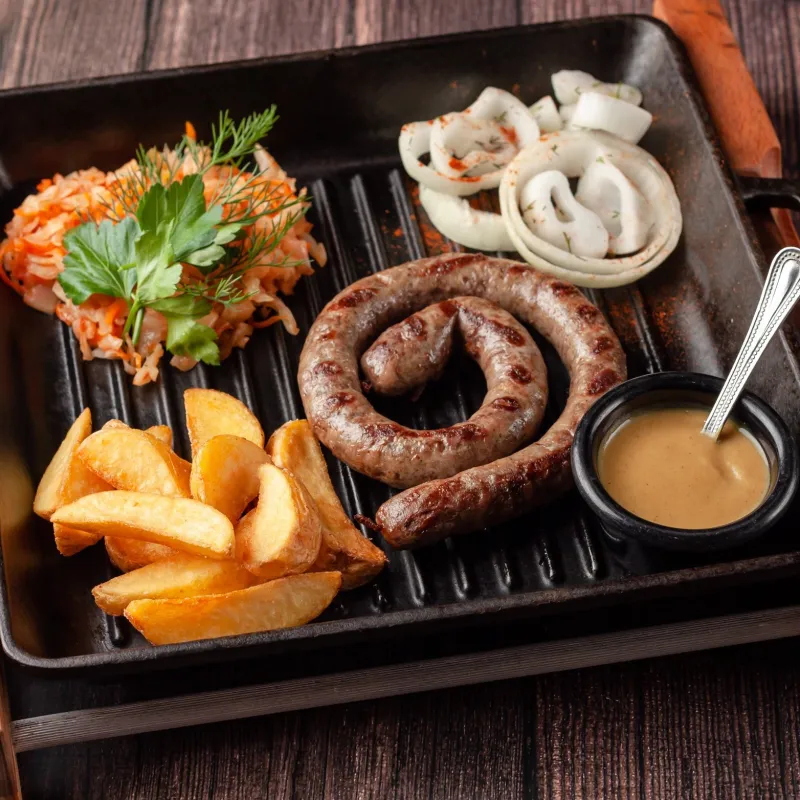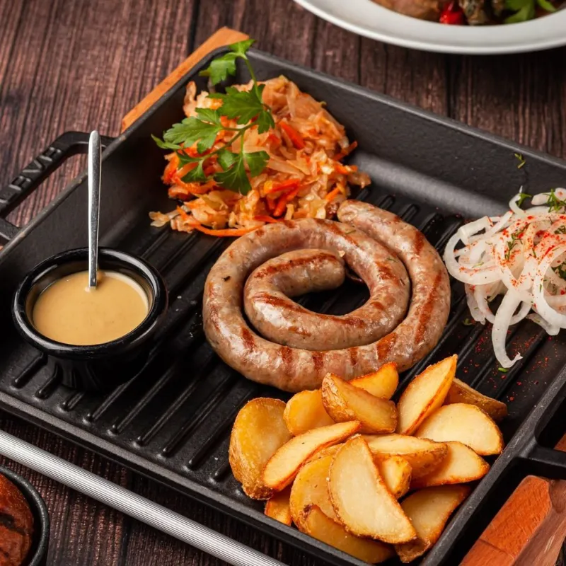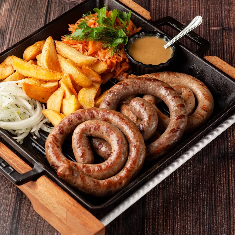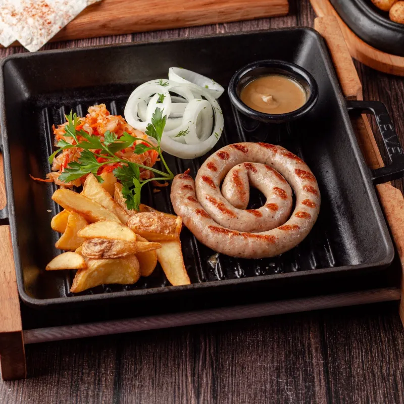 Подается с маринованным луком, картофельными дольками, тушеной капустой