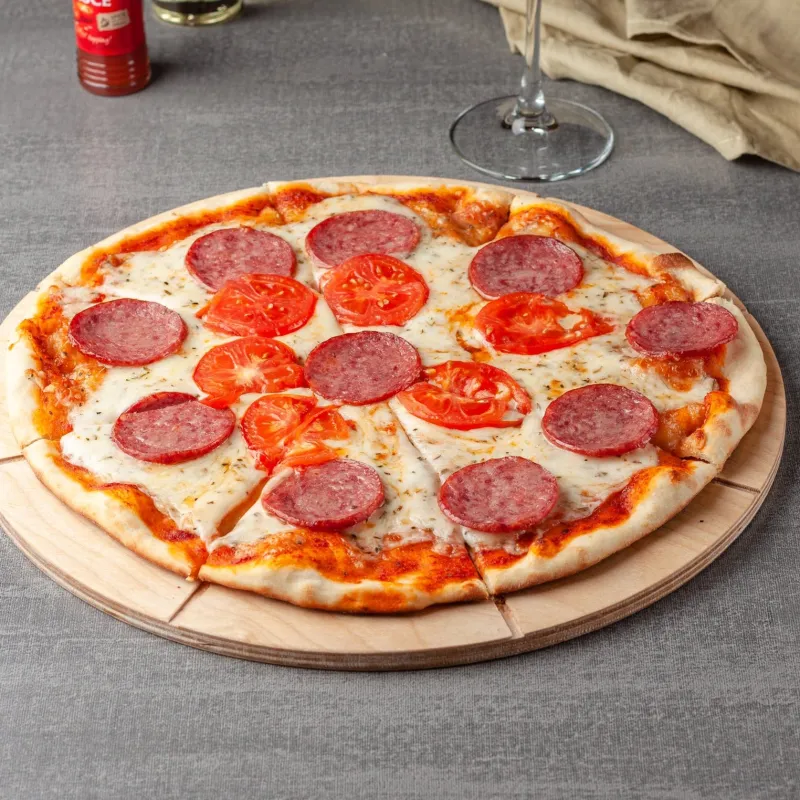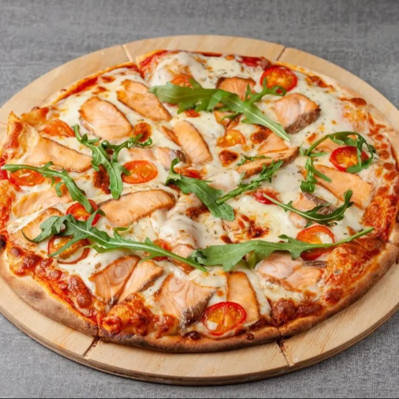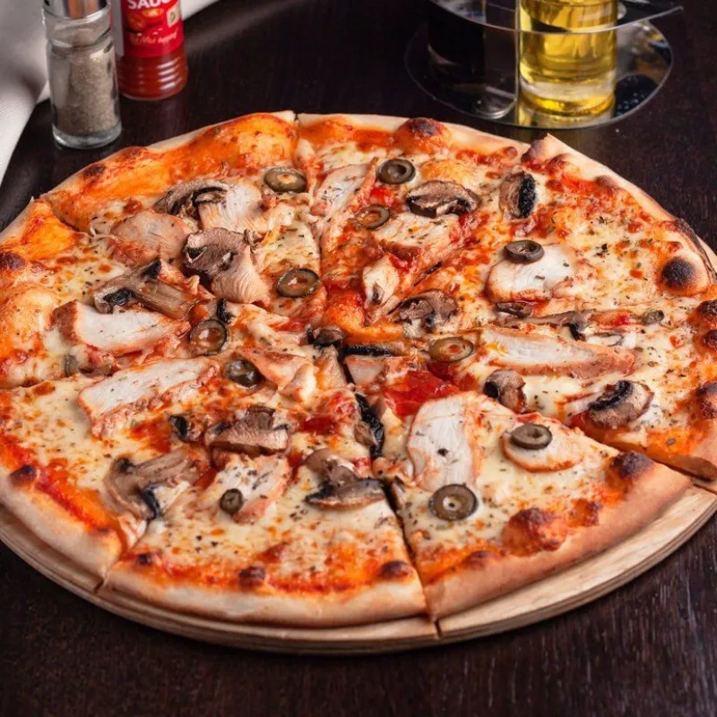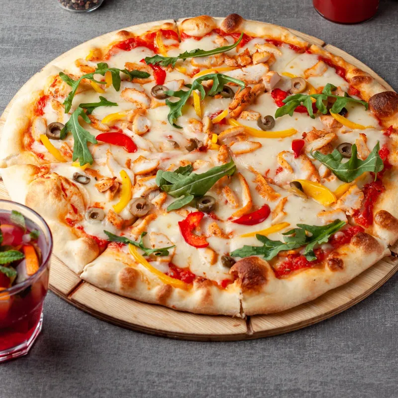 Моцарелла, куриное филе, маслины, болгарский перец, руккола.