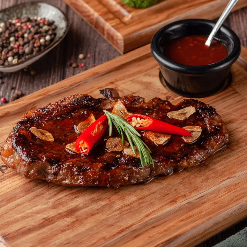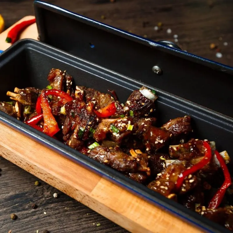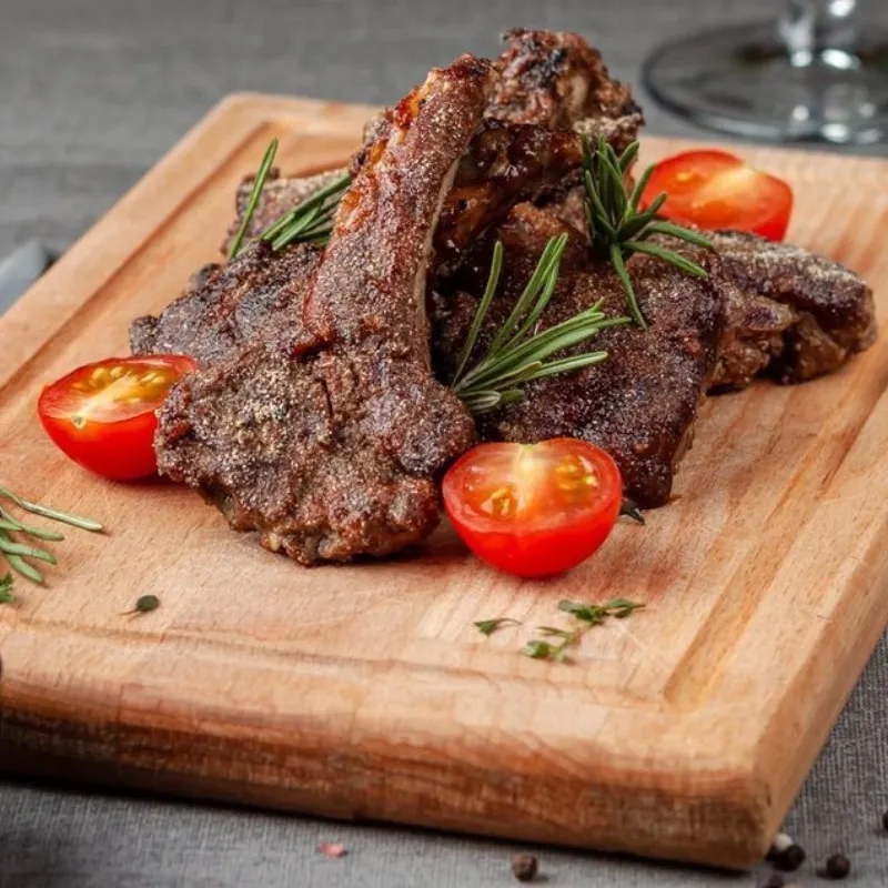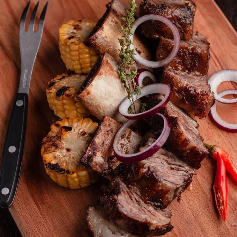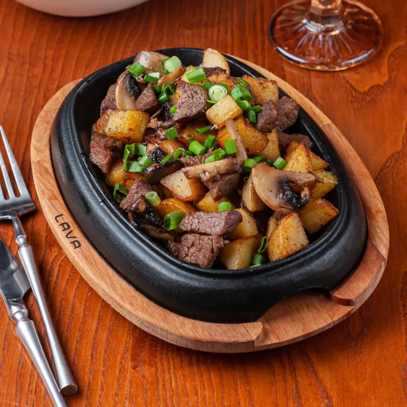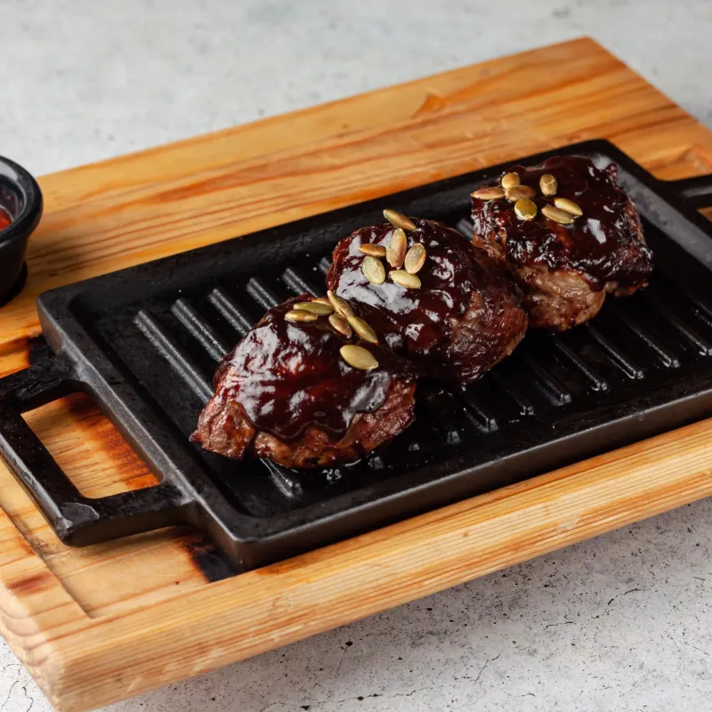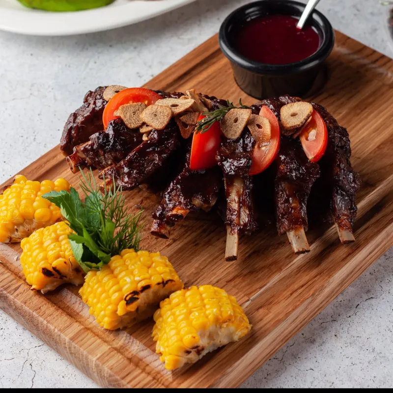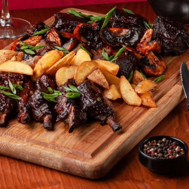 Говяжьи ребра bbq, томления говядина, ароматная баранья корейка. Картофельные дольки Грибы в соусе ббк