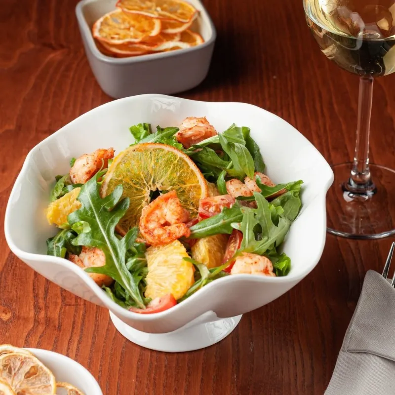Тигровые креветки, микс салата, руккола, помидоры черри, мякоть апельсина, соус маракуйя
