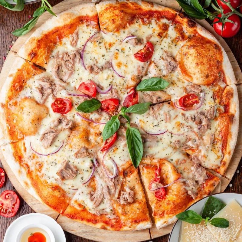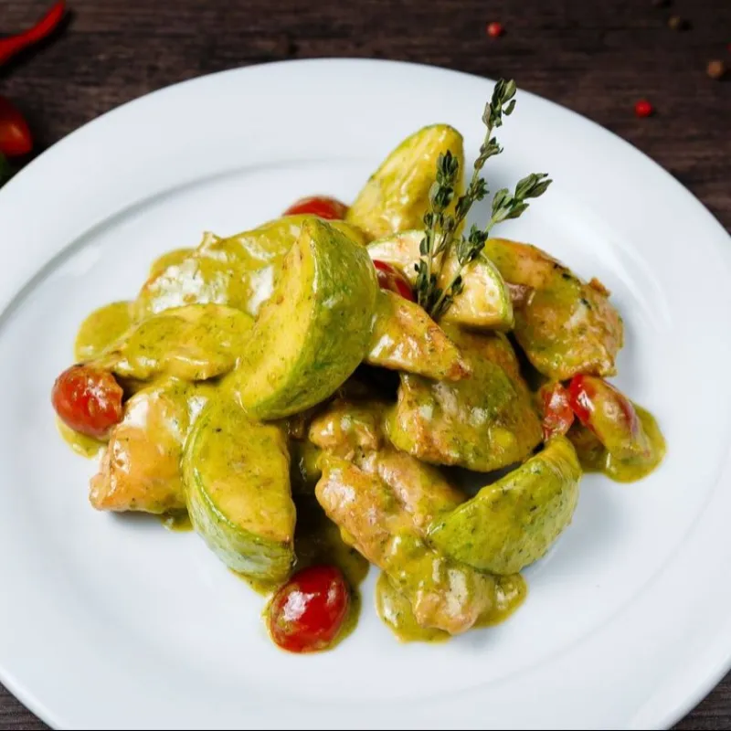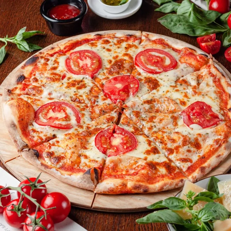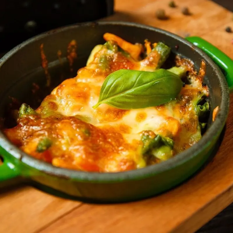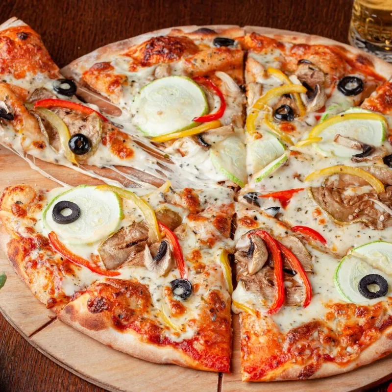 Моцарелла, кабачки, болгарский перец, шампиньоны, маслины, соус песто.