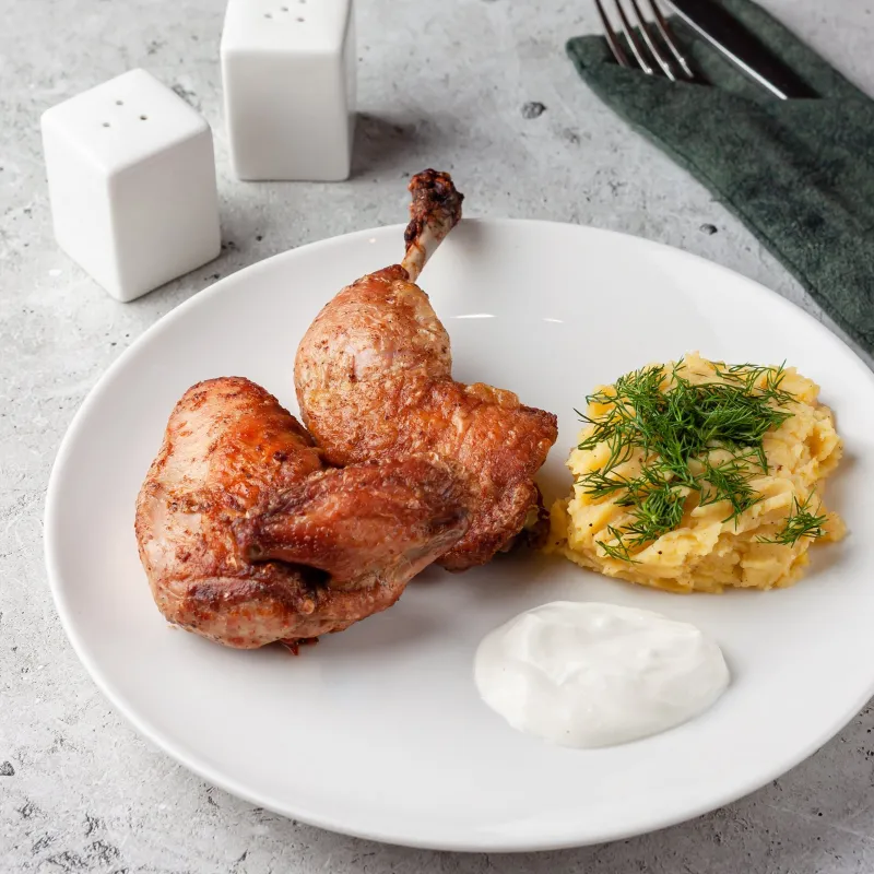 Запеченный цыпленок с размятым молодым картофелем.