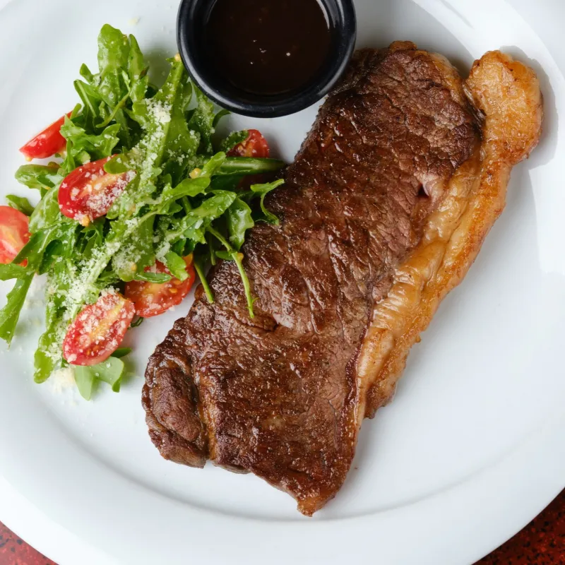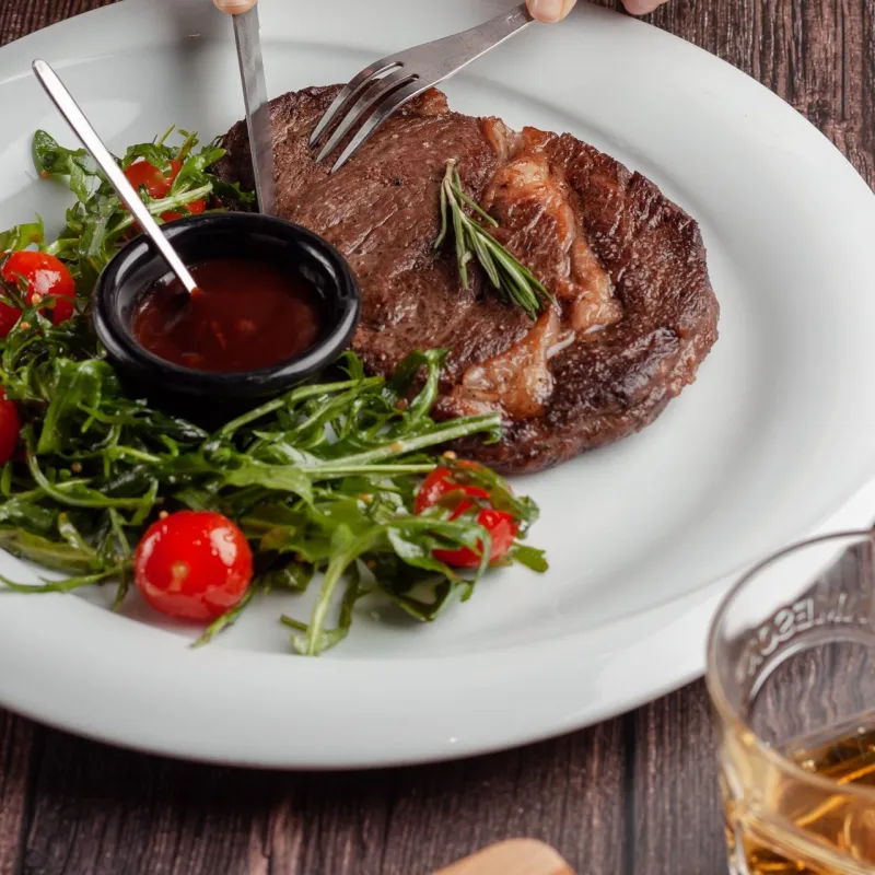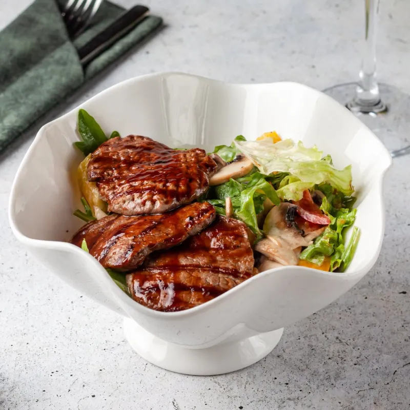 Говяжья вырезка, помидоры черри, свежие сырые шампиньоны, микс салата, руккола, болгарский перец, медово-горчичный соус