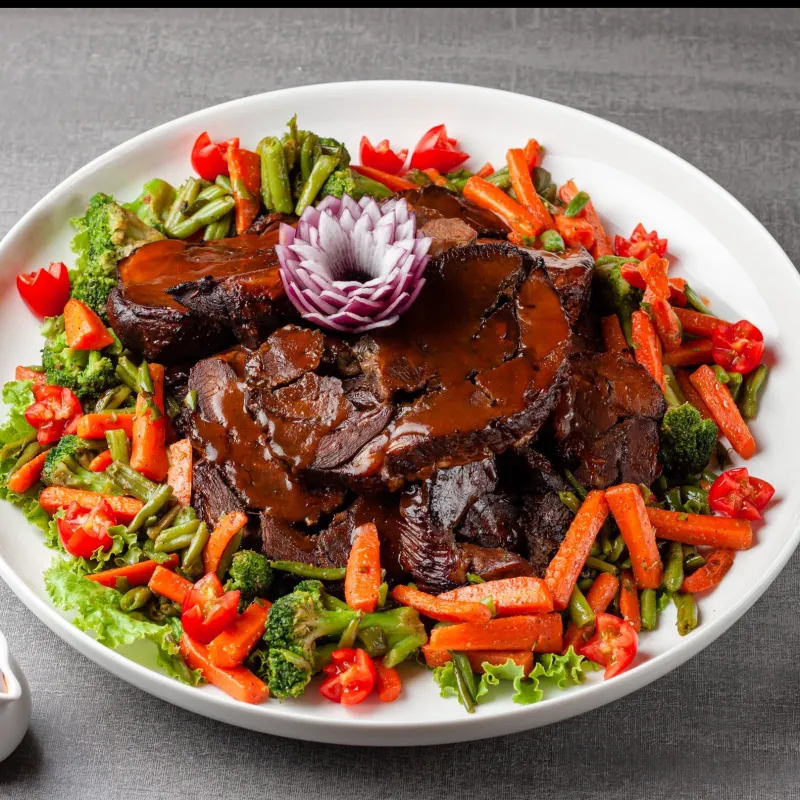 Тушеные овощи с мраморной говядиной. Kazbeef