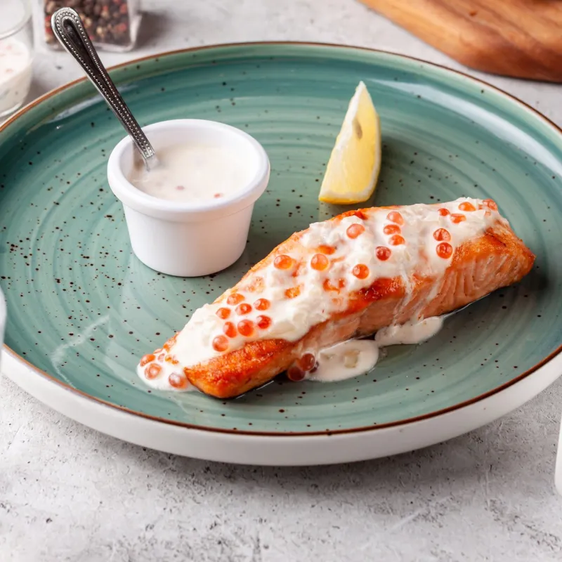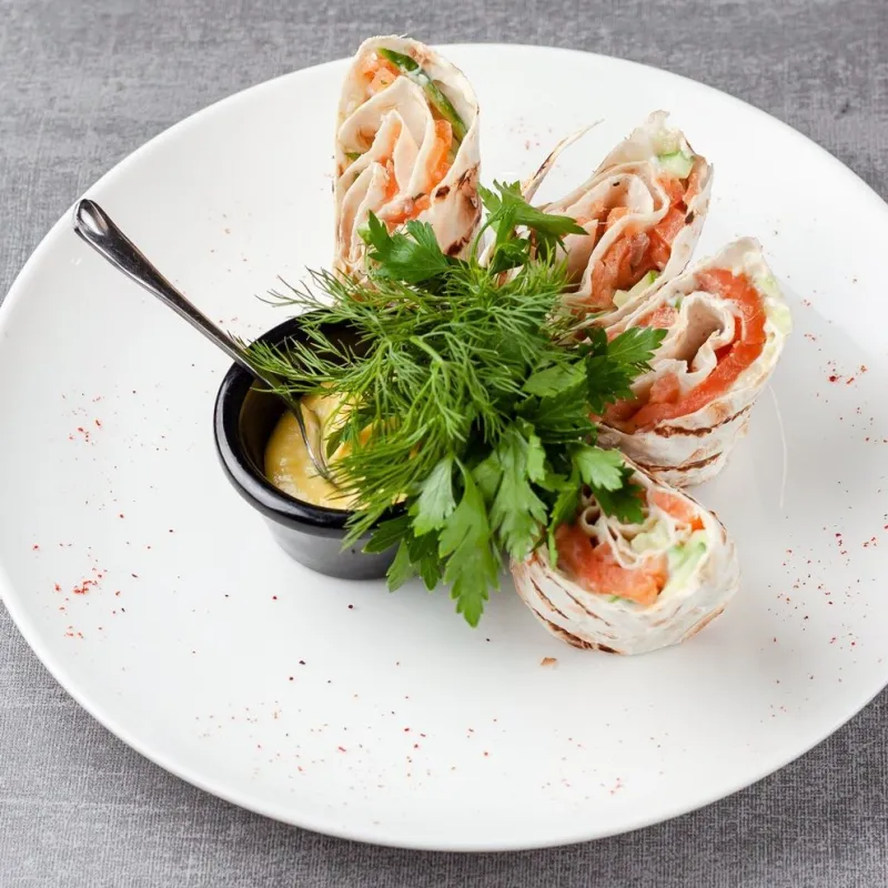 Лаваш, плавленный сыр, соленая семга, огурец, соус маракуя