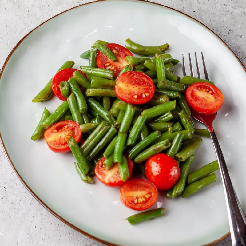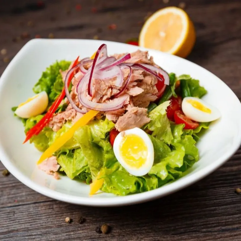 Микс салата, стручковая фасоль, болгарский перец, черри, перепелиные яйца, красный лук и тунец