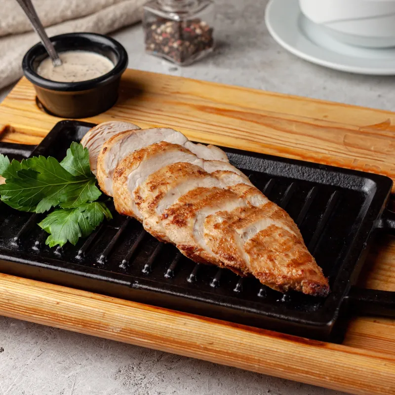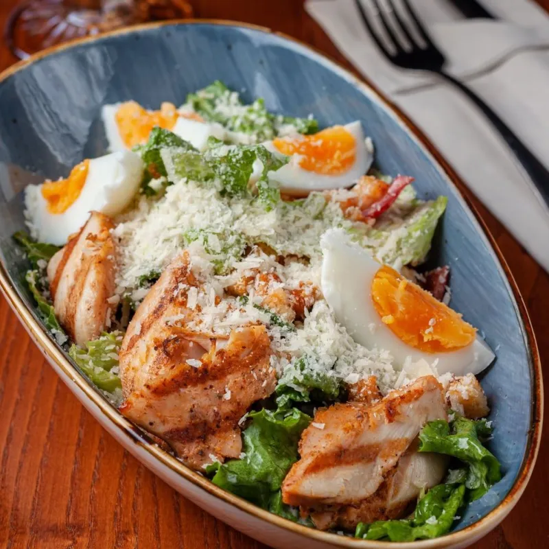 Куриное филе sous-vide, микс салата, помидоры, сухари, пармезан
