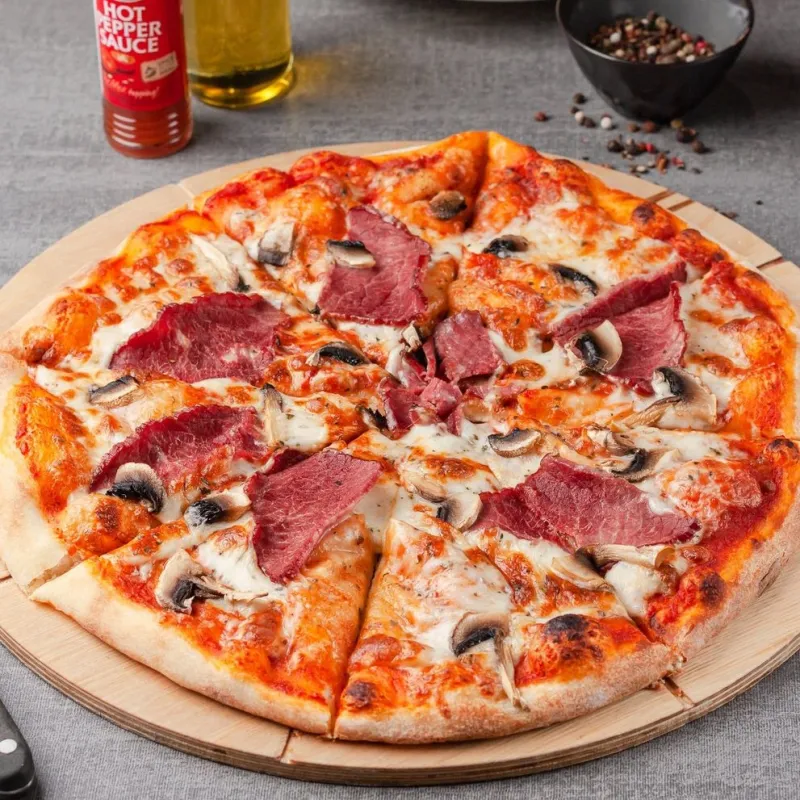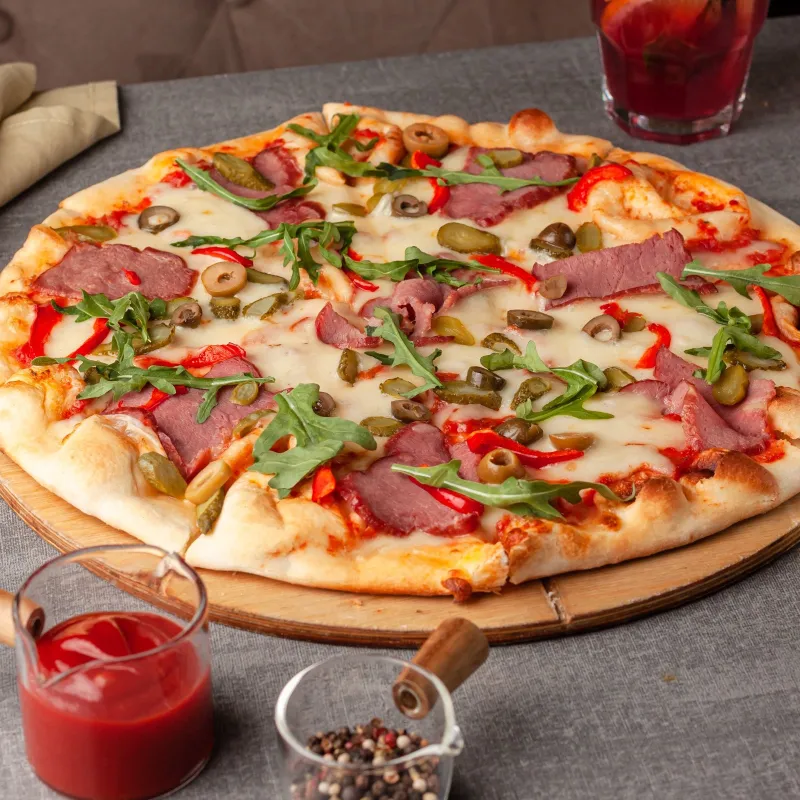 Моцарелла, копченая говядина, корнишоны, болгарский перец, руккола, маслины