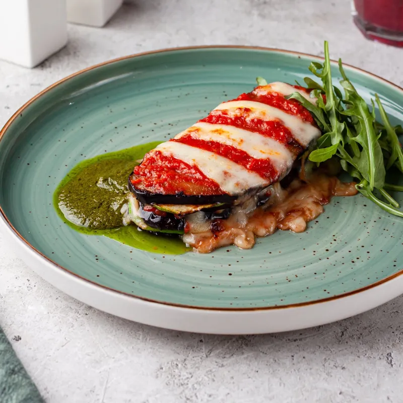 Баклажаны, цукини, моцарелла, пармезан, руккола, соус песто