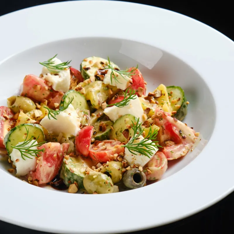 Огурцы, помидоры, оливки, миндаль, домашний сыр, зелень, бальзамик.