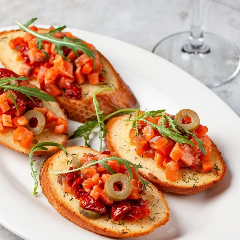Чесночный багет, соленая семга, вяленые томаты, маслины и руккола