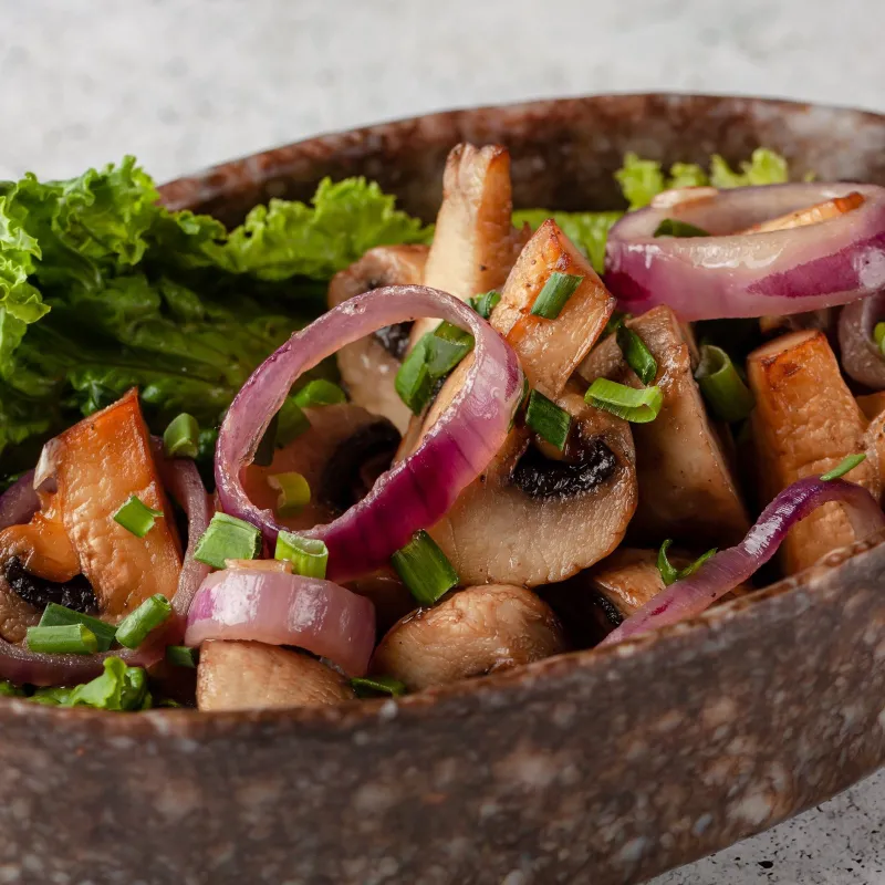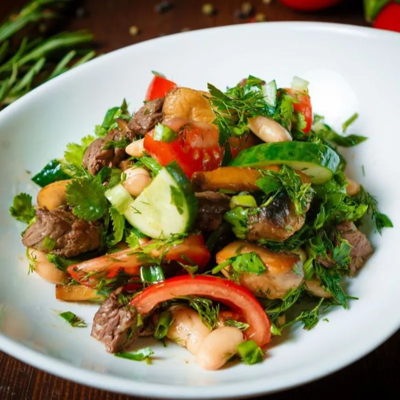 Фасоль, говяжья вырезка, шампиньоны, огурец, помидоры, лук, кинза и петрушка