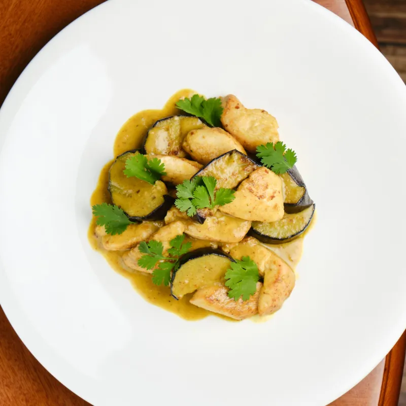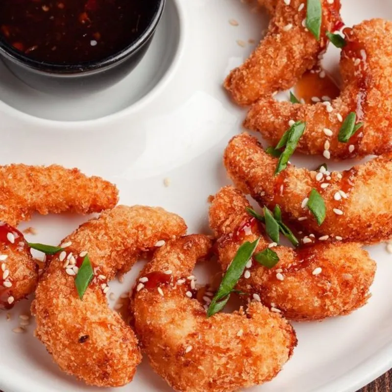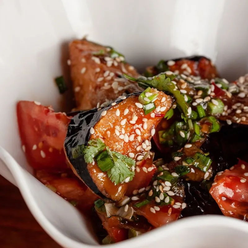 Хрустящие баклажаны в кисло-сладком соусе, томаты, лук, кинза