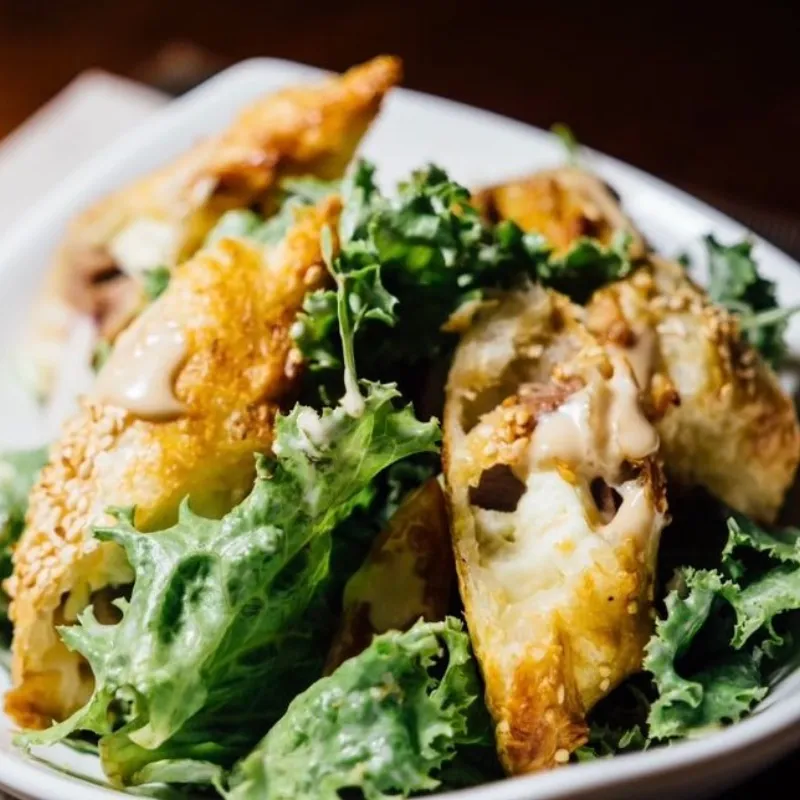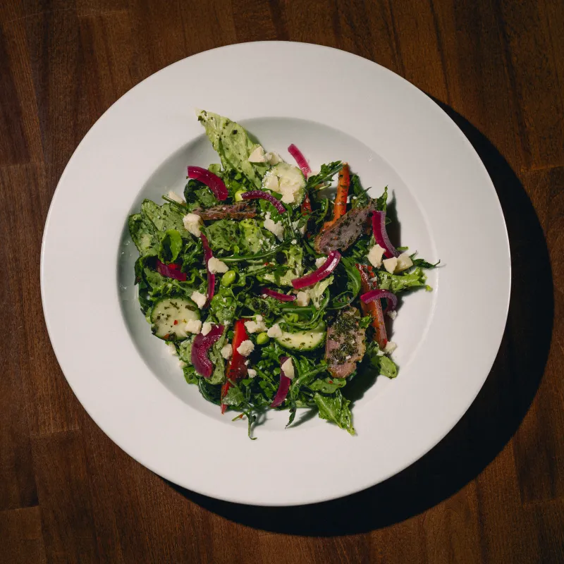 Утка, пармезан, микс салата, овощи, соус чимичури, болгарский перец красный маринованый лук, бобы эдамаме.