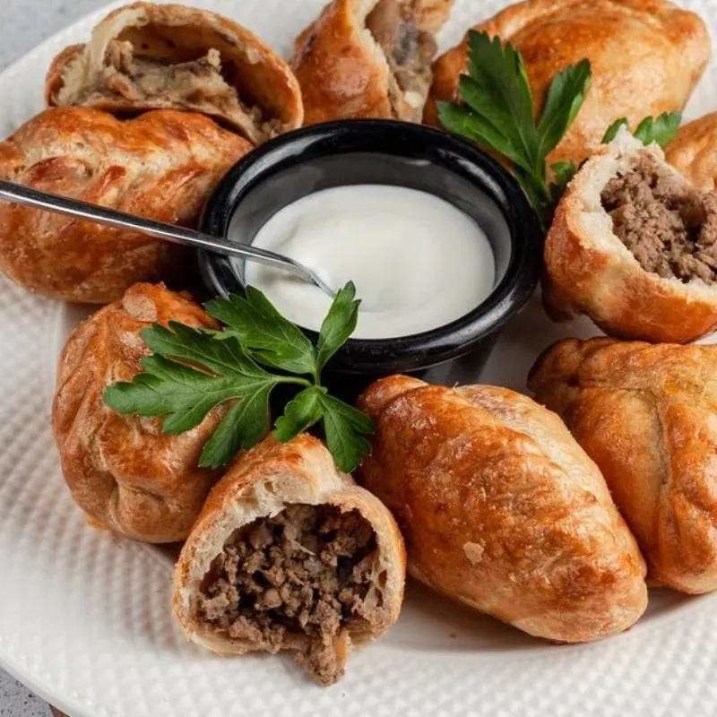 Мини пирожки с мясом, печенью, капустой, картофелем и грибами(8шт). Подается со сметаной.