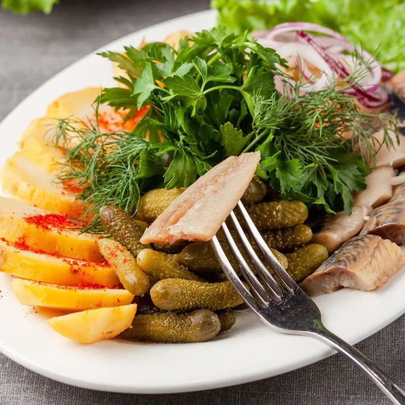 Сельдь, картофель, лук, корнишоны, капуста